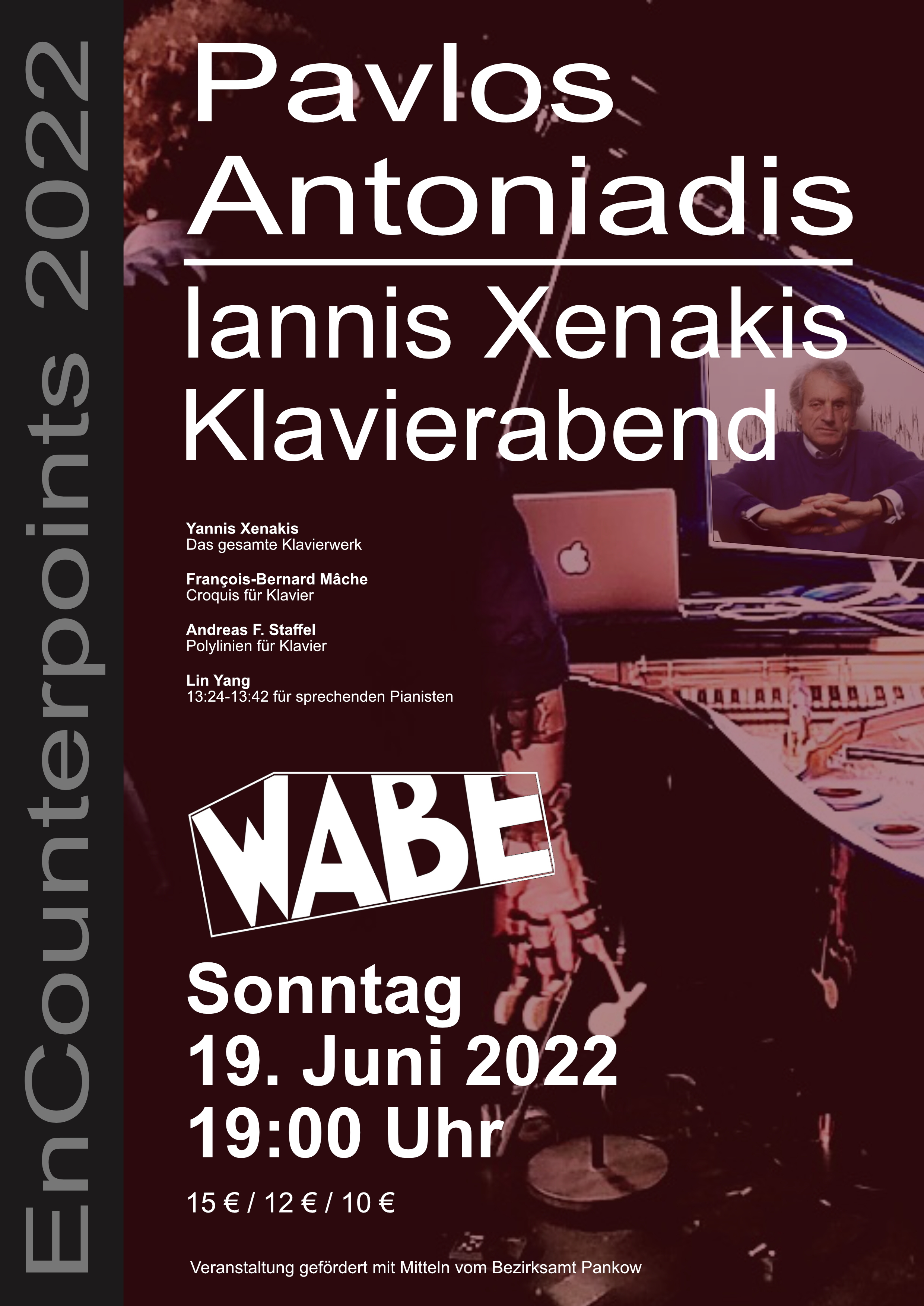 Ein Klavierabend zum hundertsten Geburtstag des griechischen Komponisten und Architekten Yannis Xenakis. Sehr sehens- und empfehlenswert, um einen ersten Zugang zu Xenakis Musik zu finden, ist die ausgezeichnete Dokumentation Xenakis Revolution. Baumeister des Klangs in der Arte-Mediathek.